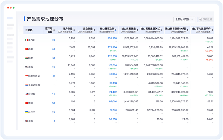 数据通 全球贸易数据检索基于100亿+海量真实进出口数据,结合精准搜索功能,精准分析全球市场变化,找寻更有价值的开发市场,挖掘新的产品开发方向,帮助企业定位增长方向。