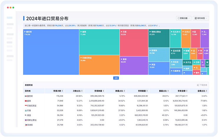 无需手动搜索与分析;一键分析全球贸易趋势、贸易流向、进出口TOP10国家等;定位高价值区域