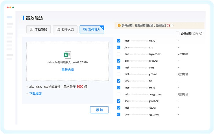 凯发K8天生赢家一触即发外贸通内置自动发送系统,根据需求智能分析投递线路,抵达率达90%以上;联系人管理、重要度匹配、无效邮箱过滤等功能,触达、跟进更高效