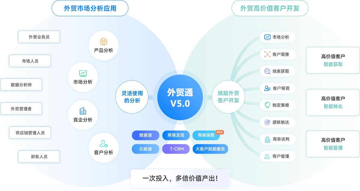 基于外贸通V5.0平台底座能力,助力外贸企业实现从市场分析、线索获取、建联触达、赢单与客户管理的全链路的数智化,加速高价值客户开发